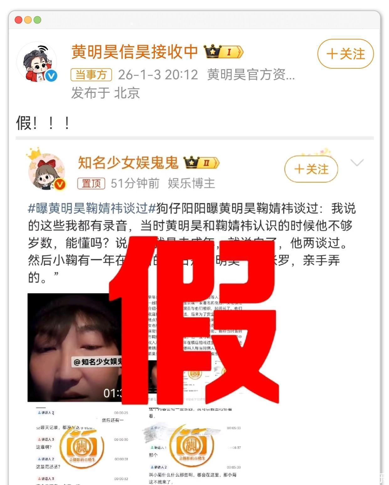 1日,知名娱记刘大锤在直播中关于黄明昊与鞠婧祎的绯闻,做出回应,表示不可能的态度,否认两人恋情。